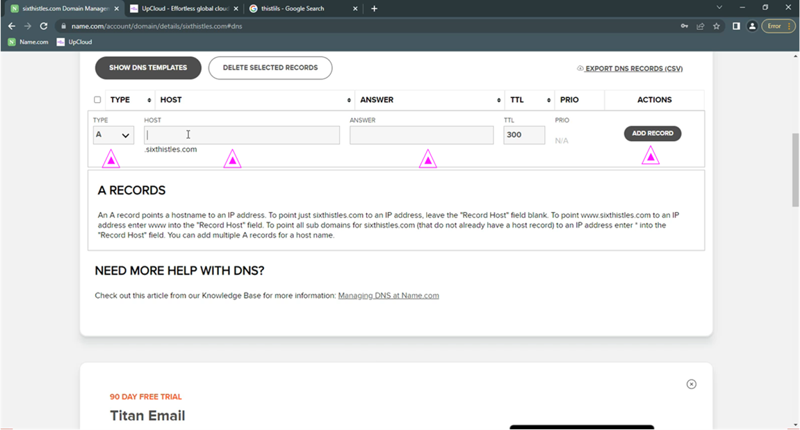 For our Second “A Record” it will be identical to the first record above EXCEPT we will add ”www” in the “Host” field. Go ahead and click “Add Record”