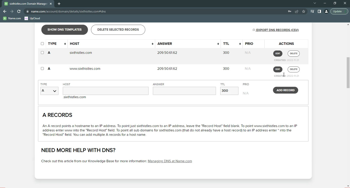 For our first “A Record” we will leave the “Host” Blank, or you can use the “@” Symbol. For “Answer” type in your server IP Address Mine is “209.50.61.62“ for “TTL” (Time-To-Live) leave it at the default of “300” the “PRIO” (Priority) is not applicable here. Now click “Add Record”